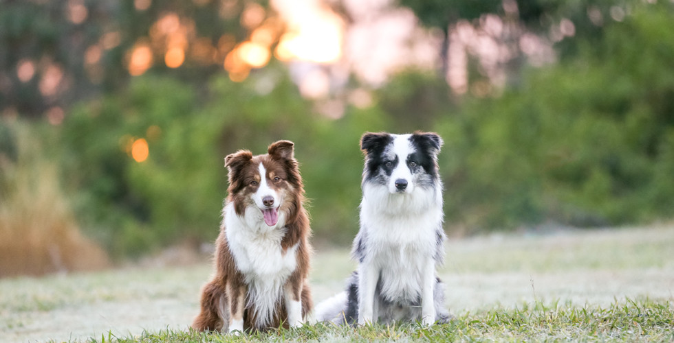 Erik and Evie. This was shot purposefully underexposed so we'd get that gorgeous colour in the sky. If I exposed for the dogs, that would have disappeared entirely. So I obviously then needed to brighten it back up in post. Then I removed the cyclists from the background, Erik's leash and did a head swap so both pups had the perfect expressions.